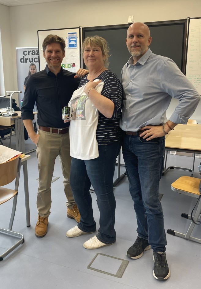 Herr Stoeff leitet dort die Merchandise-Schülerfirma „crazydruck“. Bei einem Vor-Ort-Termin stellte er seine Produktionswerkstatt vor. Die Lehrkräfte der FGO erhielten dabei viele hilfreiche Informationen und wertvolle Tipps rund um die Herstellung von Merchandise-Artikeln. Gemeinsam wurde der gesamte Ablauf durchgespielt – von der Bestellung eines Druckmotivs über die Erstellung der Druckvorlagen bis hin zum eigentlichen Druckvorgang.