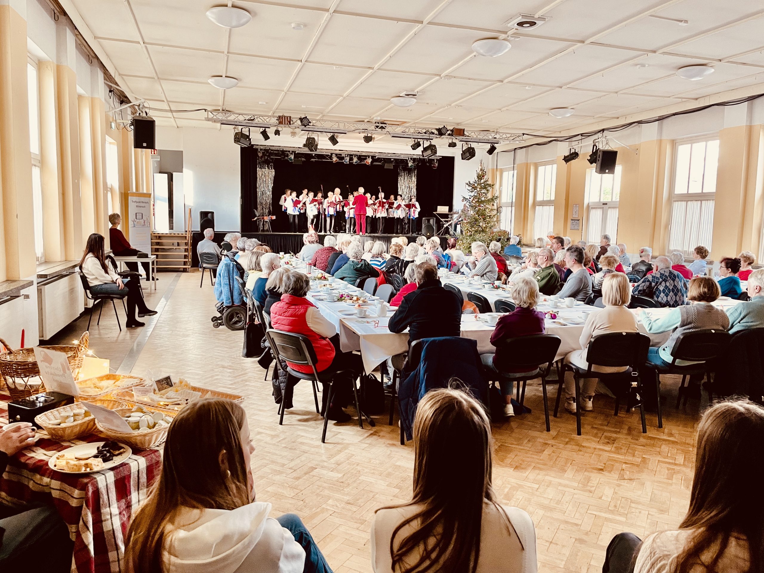 „In der Weihnachtsbäckerei gibt’s so manche …“ Dieses und andere beliebte Weihnachtslieder hallten vom Seniorenchor vorgetragen durch das Kulturhaus Lehnitz bei Kaffe und Kuchen. Die Schülerinnen und Schüler des Wahlpflichtkurses „Pflege und Erziehung“ freuten sich, bei diesem herzerwärmenden Event aushelfen zu dürfen. „Dabei kommt man schnell in Kontakt mit den Senioren. Kurz nachgefragt, ob Kaffee nachgeschenkt werden darf, und man bekommt ein Lächeln zurück,“ so eine Schülerin des Kurses. Während sich einige Schülerinnen und Schüler in der Bedienung üben konnten, halfen andere beim Abwasch, Aufräumen und Tische wegräumen tatkräftig mit. Und nebenbei gab‘s auch für den Kurs leckeren Kuchen und ganz viel Wertschätzung von den Senioren und den Organisatoren Sandra Genz und Ortsvorsteher Matthias Hennig.