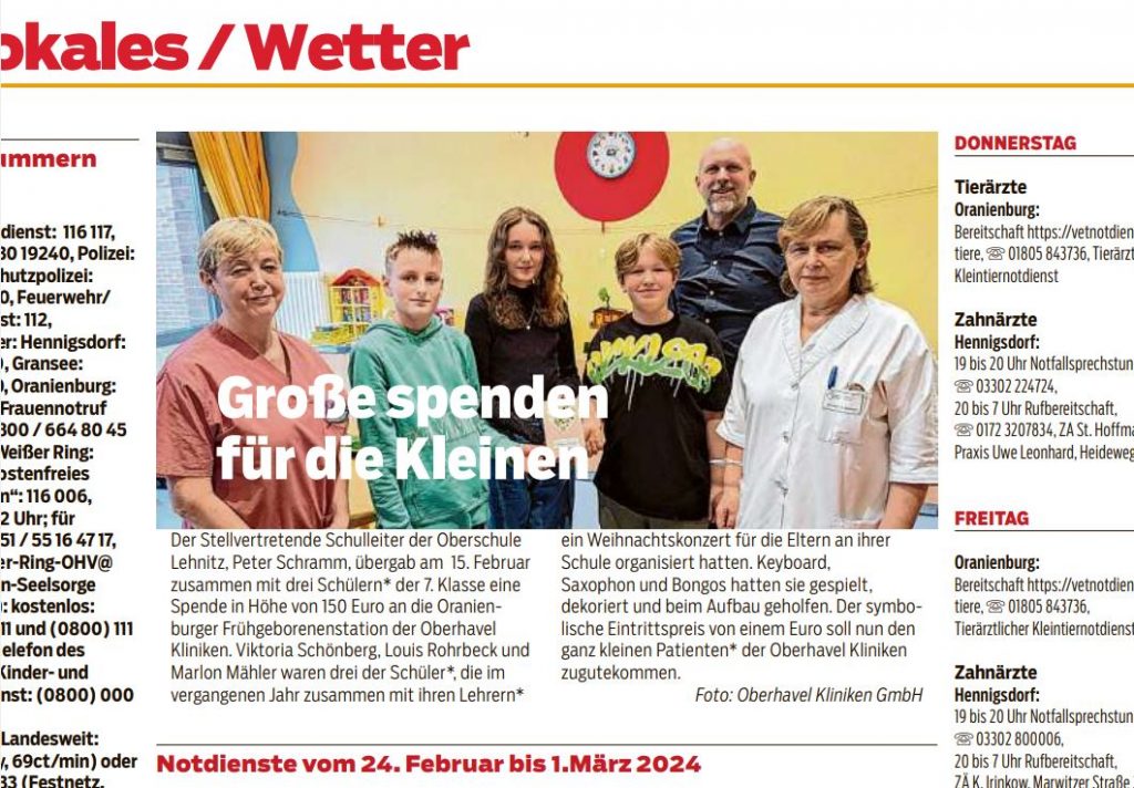 Am 15.2.2024 besuchten Schülerinnen und Schüler der 7.Klassen und der stellv. Schulleiter der OSL die Kinderstation der Oberhavelklinik in Oranienburg.