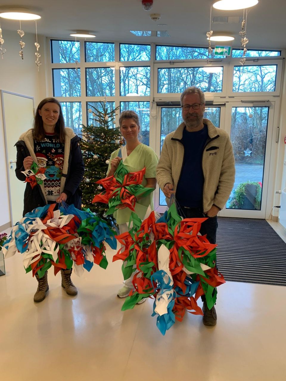 Die Klasse 7/3 unter der Leitung von Frau Lehnert und Herrn Schäberle nutze den Projekttag am 5.12.2024, um für das stationäre Hospiz in Oranienburg weihnachtliche Deko und Grußkarten zu entwerfen. Hierbei entstanden große Sterne für die Zimmer der Gäste im Hospiz und weihnachtliche Karten. Am Nachmittag brachten die beiden Klassenlehrer die liebevoll gebastelte Deko zum Hospiz, wo diese sofort an die Gäste verteilt wurde.
